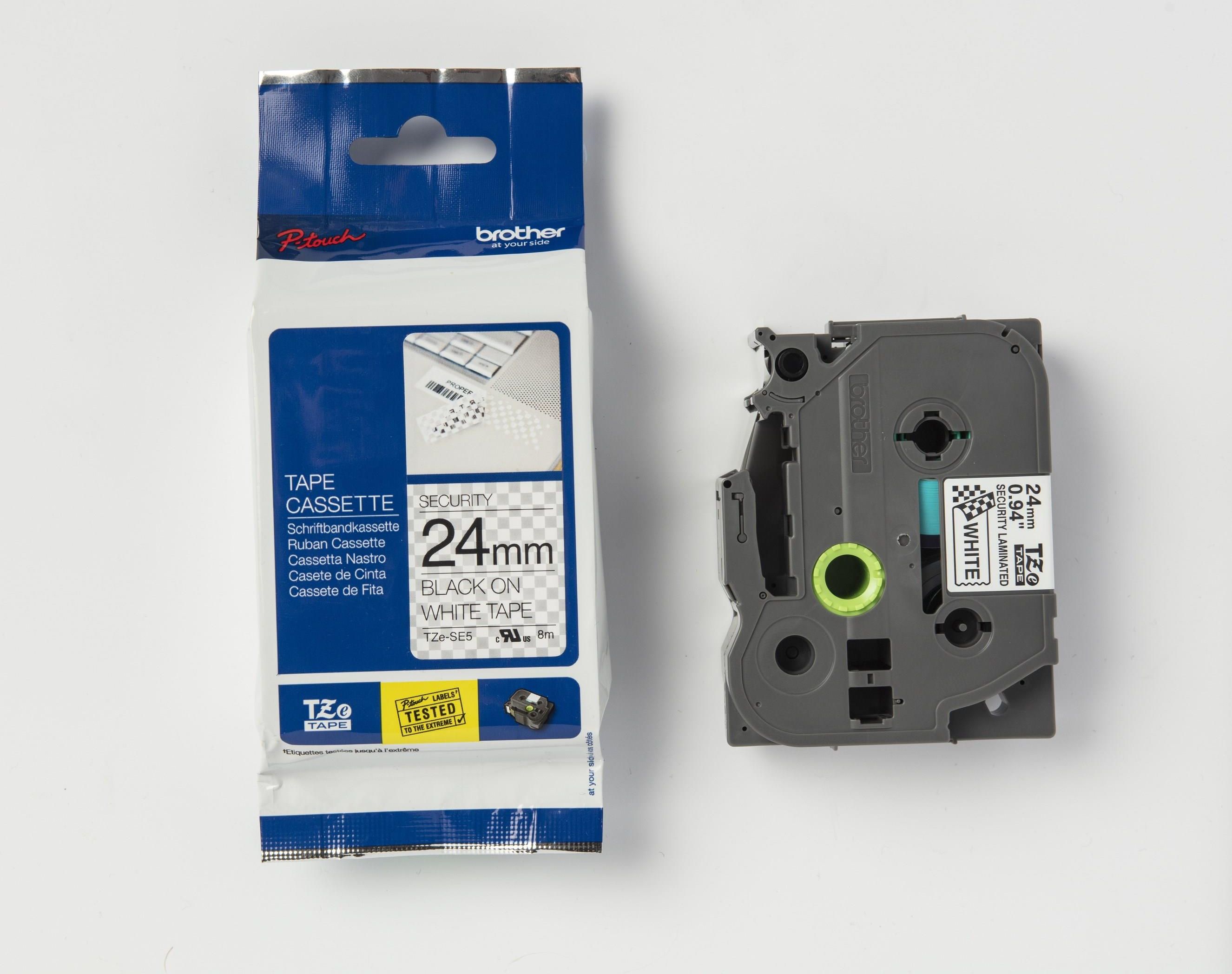 Brother TZe-SE5 24 mm szerokości, 8 m długości Wysokiej jakości oryginalna taśma firmy Brother Zapewnia wyraźne i trwałe rezultaty Opis produktu  Brother TZe-SE5 Chroń się przed kradzieżą i manipulacją, dzięki oryginalnej taśmie zabezpieczającej TZe-SE5 firmy Brother. Ta dyskretna taśma zabezpieczająca została zaprojektowana tak, aby zapewnić Ci spokój, ostrzegając, jeśli ktoś ingerował w Twoją własność.         Kompatybilne z Brother PT-P910BT,  PT-H500, PT-P750W, PT-P900W, PT-P950NW, PT-D600VP, PT-D800W, PT-E550WVP, PT-P710BT, PT-7500VP, PT-2420PC, PT-2430PC, PT-2470, PT-2480, PT-2700VP, PT-2730VP, PT-3600, PT-7600VP, PT-9200DX, PT-9400, PT-9500PC, PT-9600, PT-P700, PT-P750TDI. Więcej informacji o produkcie  Brother TZe-SE5 Oryginalna taśma zabezpieczająca TZe-SE5 firmy Brother z czarnym nadrukiem na białym tle. Powyższa taśma jest idealnym rozwiązaniem do tworzenia etykiet bezpieczeństwa elektrycznego. Po odklejeniu taśmy zabezpieczającej TZe-SE5 etykieta pozostawia wzór szachownicy. Taśma pozwoli Ci na ochronę poufnych danych w teczkach z aktami osobowymi, skrzynkach lub innym miejscu. Wzór szachownicy będzie jasną informacją, iż bezpieczeństwo danych zostało naruszone. Taśmy TZe są kompatybilne z drukarkami P-touch. Wybierając taśmę TZe-SE5, możesz mieć pewność, że Twoja drukarka etykiet będzie drukować sprawnie, tworząc jasne, czytelne i trwałe etykiety.