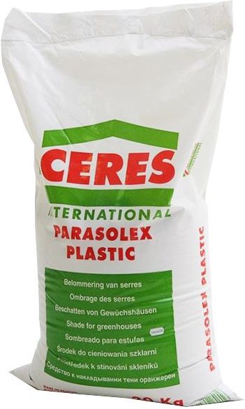 PARASOLEX PLASTIC 20 KG PARASOLEX PLASTIC – CAŁOSEZONOWY PREPARAT DO CIENIOWANIA TUNELI FOLIOWYCH (NIE NISZCZY FOLII) Parasolex Plastic przeznaczony jest do cieniowania tuneli foliowych. Zawiera specjalny klej, który gwarantuje stabilność preparatu na folii, a jednocześnie nie niszczy folii. Podczas słonecznej pogody zapewnia zaciemnienie tunelu foliowego, co zabezpiecza go przed nadmiernym nagrzewaniem. Zaletą preparatu jest odporność na zmywanie przez deszcz, dzięki czemu działa skutecznie i długotrwale. Parasolex Plastic do tuneli foliowych - zużycie Preparat wystarcza na zacieniowanie od 600 do 1200 m2 powierzchni w zależności od stopnia zacienienia. Parasolex Plastic do cieniowania folii - sposób użycia Przygotowanie preparatu: proszek wsypać do wody (najlepiej o temperaturze pokojowej), dobrze wymieszać, odczekać kilkadziesiąt minut, aby doszło do całkowitego rozpuszczenia proszku, ponownie silnie zamieszać. Cieniówkę Parasolex Plastic Ceres można nanosić na suchą powierzchnię przy pomocy rozpylacza lub pędzla. Najlepiej zastosować przy umiarkowanym nasłonecznieniu oraz po intensywnym deszczu, który zmyje kurz z folii. Należy unikać bardzo wysokich temperatur, ponieważ folia staje się zbyt elastyczna i zmienia się jej struktura powierzchniowa, a co za tym idzie, preparat mógłby dostać się w głąb folii. Utrudniłoby to jego odpadnięcie po pierwszych przymrozkach.