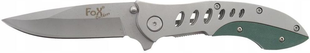 NÓŻ KIESZONKOWY FOX OUTDOORNóż o kolorystyce srebrno zielonej , uchwyt posiada powłokę antypoślizgową, który poprawia chwyt i nie pozwala wyśliznąć się ostrzu. Jest lekki i poręczny dzięki czemu zmieścimy go praktycznie wszędzie. O nasze bezpieczeństwo podczas używania dba system Liner Lock, który nie pozwala na samoczynne złożenie się noża. Nóż posiada na rewersie metalowy klips do pasa/kieszeni który można odkręcić. Idealny dla wędkarzy myśliwych miłośników survivalu itp. Specyfikacja: - Producent FOX Outdoor, - Waga 150 g, - Wymiary: - Całkowita długość 19,5 cm, - Długość ostrza 8,5 cm, - Długość złożonego noża 11,5 cm
