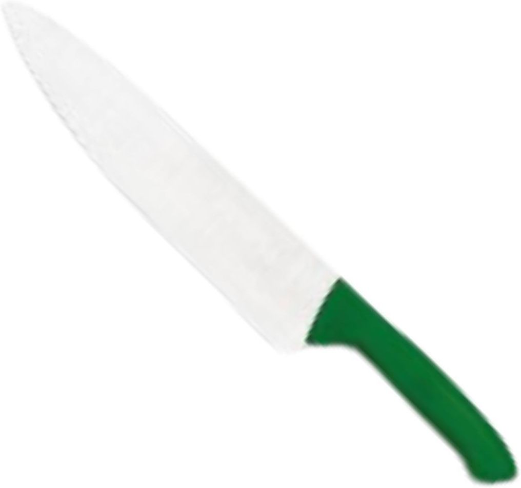 Nóż kucharski z zieloną rękojeścią, marki Stalgast. gładkie ostrze wykonane ze stali chromowo-molibdenowo-wanadowej X50CrMoV15 wygodny, lekki uchwyt wykonany z tworzywa (PP) idealny do krojenia i szatkowania