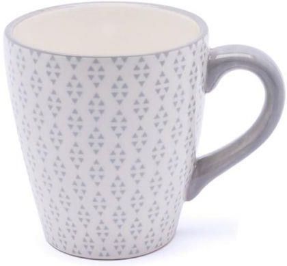 Kubek z uchem Trójkąty marki Tadar. Posiada delikatny nadruk geometryczny w kolorze szarym. Wyroby ceramiczne powracają, znów modne w naszych gospodarstwach jak przed laty. Charakteryzują się lekkością wykonania i prostotą, w świetle ładnie połyskujące. Cechy produktu - elegancka i praktyczna seria naczyń, - kubek z uchem, - wykonany z naturalnej ceramiki, - posiada geometryczne zdobienie w trójkąty, - kolor: biały (kremowy), szary. Wymiary produktu - pojemność 450 ml, - średnica 9,5 cm, - wysokość 11 cm, - długość 14 cm, - waga 302 g. WAŻNE! Jako wyrób ceramiczny, może posiadać lekkie niedoskonałości powstałe w procesie produkcji (nierówności, niedomalowania, kropeczki, wybrzuszenia), które nie wpływają na jakość użytkowania ani na wartość produktu.