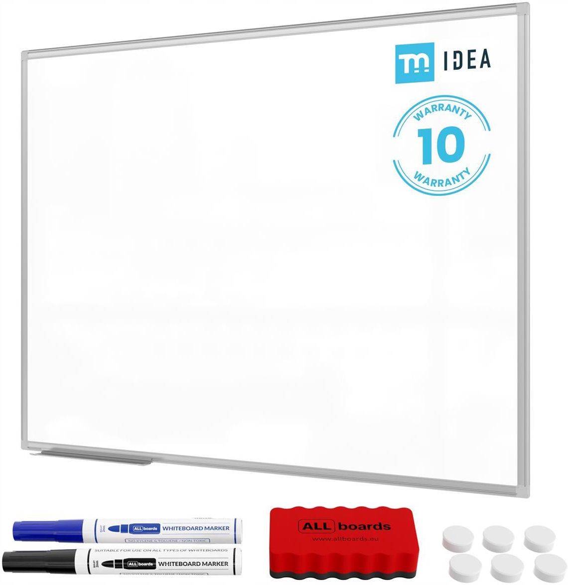 Tablica magnetyczna biała 120x90 cm suchościeralna w ramie aluminiowej + zestaw akcesoriów - TM IDEA® seria Flex Kraj produkcji: POLSKA | Rozmiar powierzchni: 120x90cm | Kolor: biały Potrzebujesz niezawodnego narzędzia do planowania, prezentacji lub codziennej organizacji pracy? Tablica suchościeralna magnetyczna TM IDEA® to estetyczne, a zarazem funkcjonalne rozwiązanie, które sprawdzi się zarówno w biurze, jak i w domowym gabinecie. Ten uniwersalny produkt umożliwia wygodne tworzenie notatek, przyczepianie dokumentów za pomocą magnesów oraz efektywne porządkowanie każdej informacji – miej to, co najważniejsze zawsze w zasięgu ręki! Cechy produktu Niezawodna powierzchnia — magnetyczna tablica ALLboards wykonana jest z blachy lakierowanej na biało, co zapewnia idealnie gładką powierzchnię, łatwość w czyszczeniu oraz długoletnią wytrzymałość. Powierzchnia tablicy pozwala na używanie markerów ścieralnych, oraz wszelkiego rodzaju magnesów. Wytrzymała rama — wykonana z aluminium zabezpieczonego przed korozją, w eleganckim szarym kolorze. Wzmocniona konstrukcja zapewnia stabilność całej tablicy i odporność na uszkodzenia. Wygodny montaż — montowana jest na ścianie za pomocą otworów w rogach tablicy. Miejsce montażu jest niewidoczne, ukryte za plastikowymi zaślepkami. Tablica może być montowana w pionie oraz w poziomie. Szerokie zastosowanie — tablica idealnie nadaje się zarówno do użytku biurowego jak i domowego. Stanowi znakomite wyposażenie nowoczesnego biura oraz placówki handlowej. Z powodzeniem sprawdza się także w domu oraz pokoju dziecięcym. Akcesoria gratis — wraz z tablicą w zestawie znajdziemy kompletne wyposażenie pozwalające na natychmiastowe użytkowanie: zestaw montażowy, półkę na akcesoria, gąbkę magnetyczną, 6 białych magnesów oraz 2 markery suchościeralne. Niezawodna powierzchnia Powierzchnia tablicy wykonana została z wytrzymałej, lakierowanej na biało blachy o właściwościach magnetycznych i suchościeralnych. Jest łatwa w czyszczeniu, gładka i lśniąca. Przyczepisz do niej każdego rodzaju magnesy: neodymowe, turystyczne czy ozdobne oraz akcesoria magnetyczne. Notatki bez trudu zetrzesz na sucho za pomocą gąbki lub papierowego ręcznika. Tablica świetnie sprawdza się zarówno w biurze, jak i w domowym zaciszu. Używaj jej jako organizera lub planera. Eksponuj na niej dokumenty firmowe, listy zakupów czy zdjęcia. Dzięki niej nie umkną Ci żadne ważne informacje! Wytrzymała rama Konstrukcja tablicy została zamknięta w eleganckiej, szarej ramie wykonanej z aluminium anodowanego. Anodowanie to proces, w czasie którego na powierzchni metalu wytwarza się warstwa tlenku glinu, który zabezpiecza przed korozją i wpływa na lśniący wygląd oraz gładkość. Dzięki temu produkt pozostaje w świetnym stanie przez długi czas. Wygodny montaż Tablica jest montowana za pomocą czterech otworów znajdujących się w rogach konstrukcji. Zestaw wkrętów niezbędnych do jej powieszenia oraz instrukcja znajdują się w zestawie. Wraz z tablicą otrzymasz eleganckie plastikowe zaślepki, dzięki czemu elementy montażowe są całkowicie niewidoczne oraz nie zaburzają estetyki produktu. Tablica może być montowana zarówno pionowo, jak i poziomo. Dostosuj ją do swoich potrzeb! Szerokie zastosowanie Biała tablica magnetyczna znajduje zastosowanie w zróżnicowanych środowiskach. Stanowi znakomite wyposażenie biura, firmy, sali konferencyjnej czy sali szkolnej. Ułatwia prezentację materiałów, pozwala na komfortowe planowanie działań oraz szybkie ustalenie planu dnia. Tablica świetnie sprawdza się również do użytku domowego – wykorzystasz ją jako planer, miejsce na magnesy turystyczne lub przestrzeń do nauki pisania i rysowania. Można przyczepiać do niej ważne informacje, zdjęcia, obrazy, listę zakupów, plan dnia – uporządkuj to, co najistotniejsze w jednym miejscu. Akcesoria gratis Tablica ALLboards jest wysyłana z kompletnym wyposażeniem, tak aby można było od razu przejść do działania! Do produktu dołączamy zestaw montażowy, półkę na akcesoria (która może zostać zdemontowana bez trudu w dowolnym momencie), gąbkę magnetyczną do łatwego zmywania pisaków, dwa markery suchościeralne oraz 6 białych magnesów.
