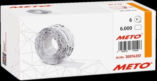 Etykiety cenowe w rolce Meto, do metkownicy jednorzędowej, 21x12 mm, 1000 sztuk, 6 rolek, biały Meto Etykiety cenowe w rolce do metkownicy jednorzędowej. Etykiety prostokątne z dziurkami. W formacie 21 x 12 mm. Z trwałym klejem. Opakowanie zawiera 6 rolek po 1000 etykiet na rolkę. Etykiety nadają się do bezpośredniego kontaktu z żywnością. Do ich produkcji używane są wyłącznie materiały od wiodących producentów kompozytów samoprzylepnych. Etykiety są wolne od lateksu, bisfenolu i metali ciężkich. Bez użycia substancji zubożających warstwę ozonową. Certyfikat FSC – promocja zrównoważonej gospodarki drewnem poprzez staranną kontrolę i korzystanie z bezpiecznych źródeł. Pozostałe certyfikaty: BRCGS, ISO14001, ISO9001. ilość etykiet na rolce: 1000 jednostka sprzedaży: 1 kolor: biały przeznaczone do: metkownic przyjazny środowisku: tak rozmiar etykiety [mm]: 21x12 usuwalna: nie jednostka sprzedaży: