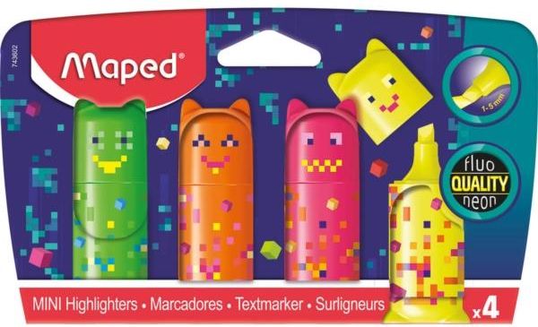 Mini zakreślacze Pixel Fluo Zaokrąglony kształt obudowy z zatyczką w kształcie zwierzaka. Korpus dekorowany grafiką, którą tworzą różnokolorowe kwadraciki układające się w fantazyjną całość. Ścięta końcówka umożliwia pisanie cienką i grubą linią od 1 do 5 mm. Tusz odporny na działanie światła – nietoksyczny o wysokiej wydajności i trwałości, do wszystkich papierów standardowych, samokopiujących, fotokopii, termopapierów i papierów faksowych. Pozostawiony bez skuwki nawet po 4 godzinach nie traci swoich właściwości. Blister kartonowy 4 kolory: żółty, pomarańczowy, zielony i różowy