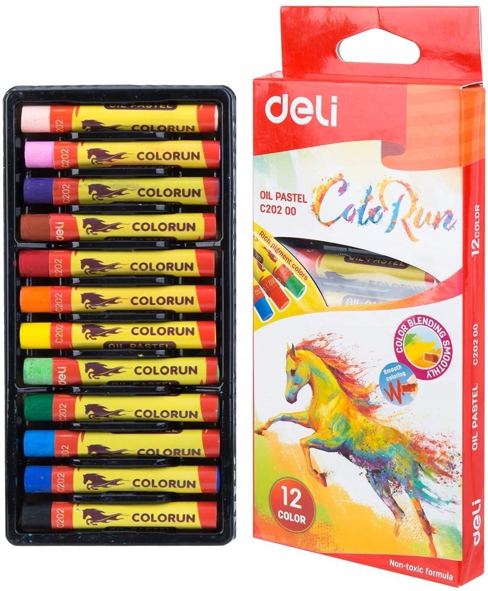 Wyjątkowe pastele olejne ColoRun Pastele olejne ColoRun od Deli to idealne akcesorium dla miłośników tworzenia sztuki. Charakteryzują się wygodną średnicą 8 mm, która świetnie leży w dłoni. Dzięki temu są nie tylko praktyczne, ale także bardzo wygodne w użyciu. Pastele te wyróżniają się nietoksycznymi składnikami, więc są bezpieczne dla dzieci, a także łatwe do usunięcia z ubrań czy rąk, co czyni je idealnymi dla młodych twórców. Intensywne kolory i łatwość użycia Dzięki intensywnej pigmentacji, pastele oferują szeroką gamę kolorów, takich jak leśna zieleń, limonkowa zieleń, jasny żółty czy cyjan. Ich miękka konsystencja umożliwia płynne, wyraziste efekty i subtelne gradienty na różnych powierzchniach, co pozwala na podniesienie poziomu każdego artystycznego projektu. Opakowanie z tacką oraz ochronnym papierem zapewnia komfort i porządek podczas pracy. Szczegóły produktu Ilość: 12 sztuk Kolory: leśna zieleń, limonkowa zieleń, jasny żółty, pomarańczowy, jasny brąz, karminowy, jasny róż, ciemny fiolet, cyjan, kobaltowy, czarny, kremowy Wysokość: 60 mm Średnica: 8 mm Ochrona: Papier ochronny o wysokości 50 mm Wymiary opakowania: 170x74x15 mm Bezpieczeństwo i praktyczne rozwiązania Nietoksyczna formuła pasteli ColoRun zapewnia bezpieczeństwo zarówno dla dzieci, jak i środowiska. Każda kredka jest owinięta papierem, co minimalizuje ryzyko zabrudzeń na palcach podczas korzystania z nich. Dodatkowo, opakowanie z wysuwaną plastikową tacką ułatwia utrzymanie porządku i organizacji miejsca pracy. Ten produkt doskonale łączy w sobie funkcjonalność z kreatywnością, umożliwiając dzieciom oraz dorosłym swobodne wyrażanie artystycznych pomysłów. EAN: 6921734963796