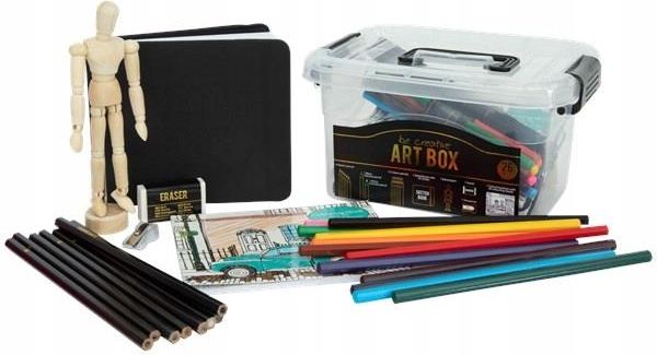 Zestaw Artystyczny Plastyczny w Pudełku ART BOX 24 elementy Stwórz najpiękniejsze szkice lub rysunki za pomocą tego praktycznego zestawu do szkicowania. Dzięki kompaktowym rozmiarom można je łatwo zabrać ze sobą. W ten sposób możesz uwolnić swoją kreatywność w dowolnym miejscu. 24 ELEMENTY Zestaw zawiera: 6 ołówków do szkicowania 1 czarny ołówek węglowy 1 biały ołówek węglowy kolorowanka mały szkicownik 50 kartek manekin gumka do zmazywania temperówka Wszystkie przedmioty umieszczone są w małym poręcznym pudełeczku, które zabierzesz ze sobą bez problemu w każde miejsce. Jest to fantastyczny zestaw startowy dla rozpoczynających swoją przygodę ze szkicowaniem! Specyfikacja: Ilość: 24 elementy
