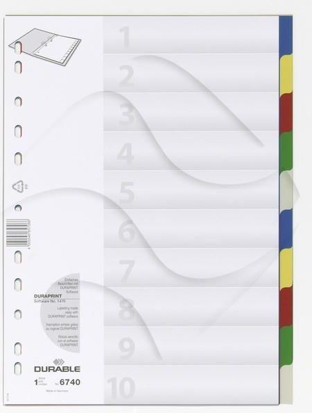 Przekładki Durable format A4 wykonane polipropylenu pionowe, 10 części bez opisu przeznaczone do przechowywania luźnych posegregowanych dokumentów, co daje możliwość szybkiego ich wyszukania nakładka ze spisem treści w zestawie uniwersalny rozstaw dziurek wymiary: wysokość 297 mm, szerokość 210/220 mm kolorowe cena z 1 sztukę