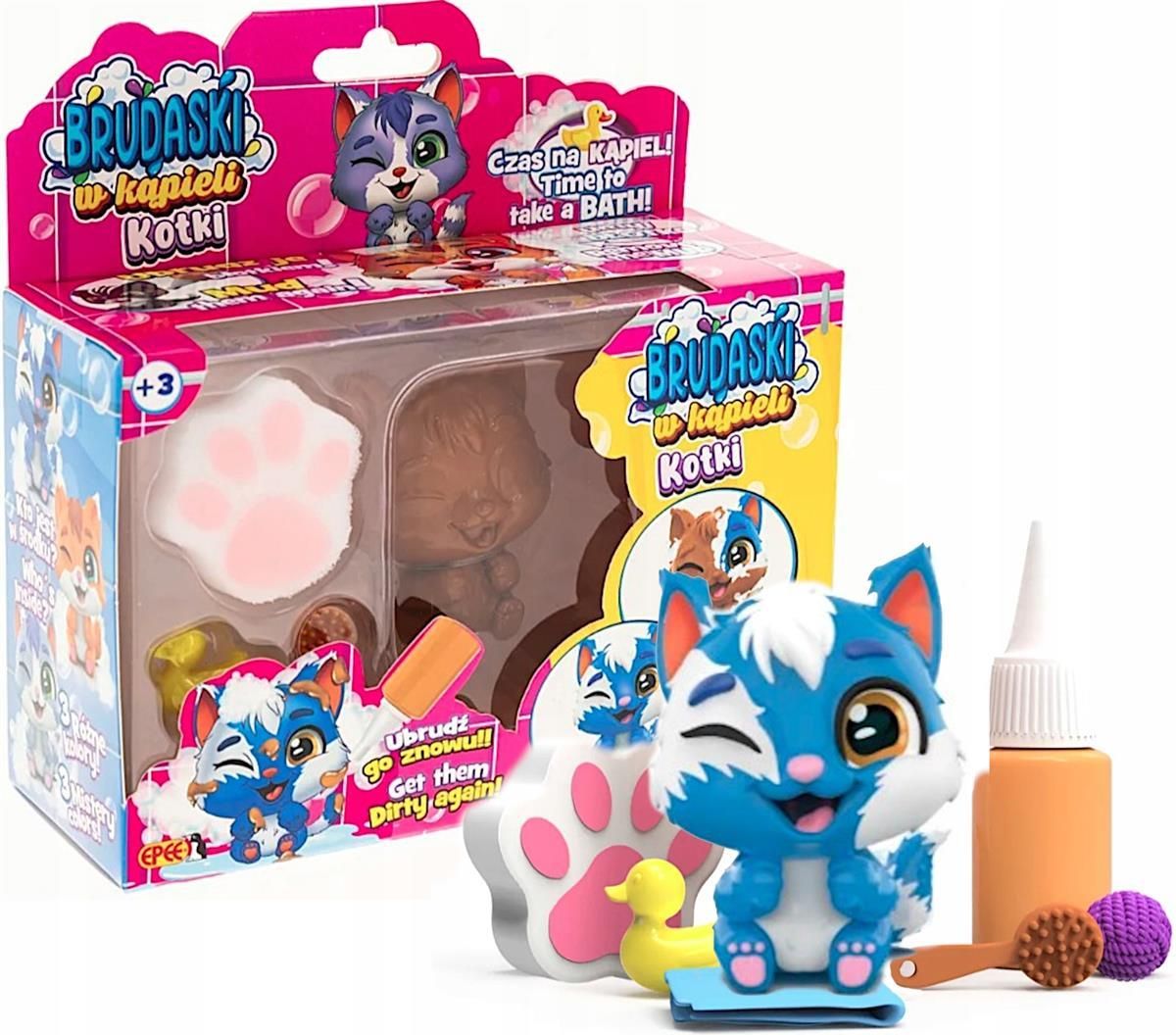 Brudaski w Kąpieli KOTKI - Zestaw bonusowy Kotki, które można brudzić i myć bez końca! Poznaj kolekcję przesłodkich kotków, które można brudzić błotkiem, myć i zaczynać całą zabawę od nowa! Brudaski w kąpieli kotki to urocze figurki, które zostały stworzone po to, by zapewnić dzieciom mnóstwo radości i niezliczone możliwości kreatywnej zabawy. Dzięki specjalnej powłoce łatwo je wyczyścić, a zabawę ulepszą dołączone do kotków akcesoria. Każdy zestaw Brudaski w kąpieli pozwala dzieciom na wielogodzinną zabawę, która rozwija wyobraźnię i umiejętności manualne. Te wspaniałe kotki będą świetnym towarzyszem podczas kąpieli, ucząc jednocześnie dbania o czystość i higienę w sposób zabawny i angażujący. Informacje o produkcie Nr katalogowy EP60344/03517 Typ Zwierzęta Wariant Zestaw Wymagania wiekowe od 3 lat Materiał Tworzywo sztuczne (plastik) Płeć Dziewczynki Chłopcy Produkt na baterie Nie Baterie w zestawie Nie Zasilanie Nie dotyczy Akcesoria w zestawie Figurka kotka Tubka z błotkiem 5 akcesoriów: gąbeczka, szczotka, kaczuszka, kłębek, ręczniczek Pozostałe parametry Wymiary opakowania: 15 x 15 x 6 cm Reklama TV 2025 Oznaczenia