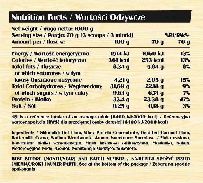 Zawiera substancje słodzące. Składniki: Mąka owsiana, Koncentrat białka serwatkowego (z mleka), mąka kokosowa odtłuszczona, Maślanka (z mleka), Kakao, Wodorowęglan Sodu, Aromat, Substancja słodząca: sukraloza. Przepis na naleśniki: Do miski lub blendera wsyp 70 gramów proszku (3 miarki - 1 porcję) i wlej około 140 ml wody lub mleka. Mieszaj wszystko do połączenia składników. Wlej ciasto naleśnikowe na rozgrzaną patelnie. Smaż dopóki na powierzchni pojawią się bąbelki, a następnie przewróć na drugą stronę. Smaż na drugiej stronie aż naleśniki uzyskają złoty kolor. Podawaj gorące z sosem lub syropem. Najlepiej spożyć przed (Miesiąc/Rok) i Numer Partii: Zobacz na spodzie opakowania. WARUNKI PRZECHOWYWANIA: Przechowywać szczelnie zamknięte, w suchym miejscu, w temperaturze pokojowej do 25°C. Chronić przed światłem. Przechowywać w sposób niedostępny dla małych dzieci. MASA NETTO: 1000g.