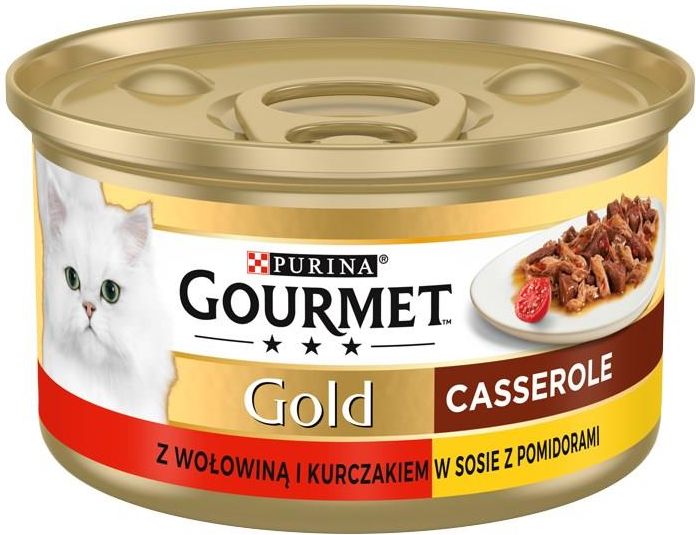 GOURMET GOLD Casserole z wołowiną i kurczakiem w sosie 24X85G Opis produktu Wykwintne przepisy, które rozpieszczą wyrafinowane podniebienie Twojego kota. Nawet najbardziej wymagający kot będzie uważał się za szczęściarza, gdy będzie mógł skosztować Gourmet® GOLD: menu z wykwintnymi przepisami, …