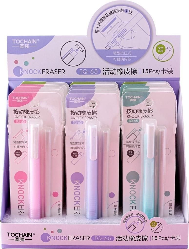 Wysuwana gumka z dodatkowym wymiennym zapasemErgonomiczny uchwytKształt cylindrycznyWymiary gumki: 120 x 6 mmTrzy pastelowe kolory obudowy15 szt. w displayuEAN: 6959023912958