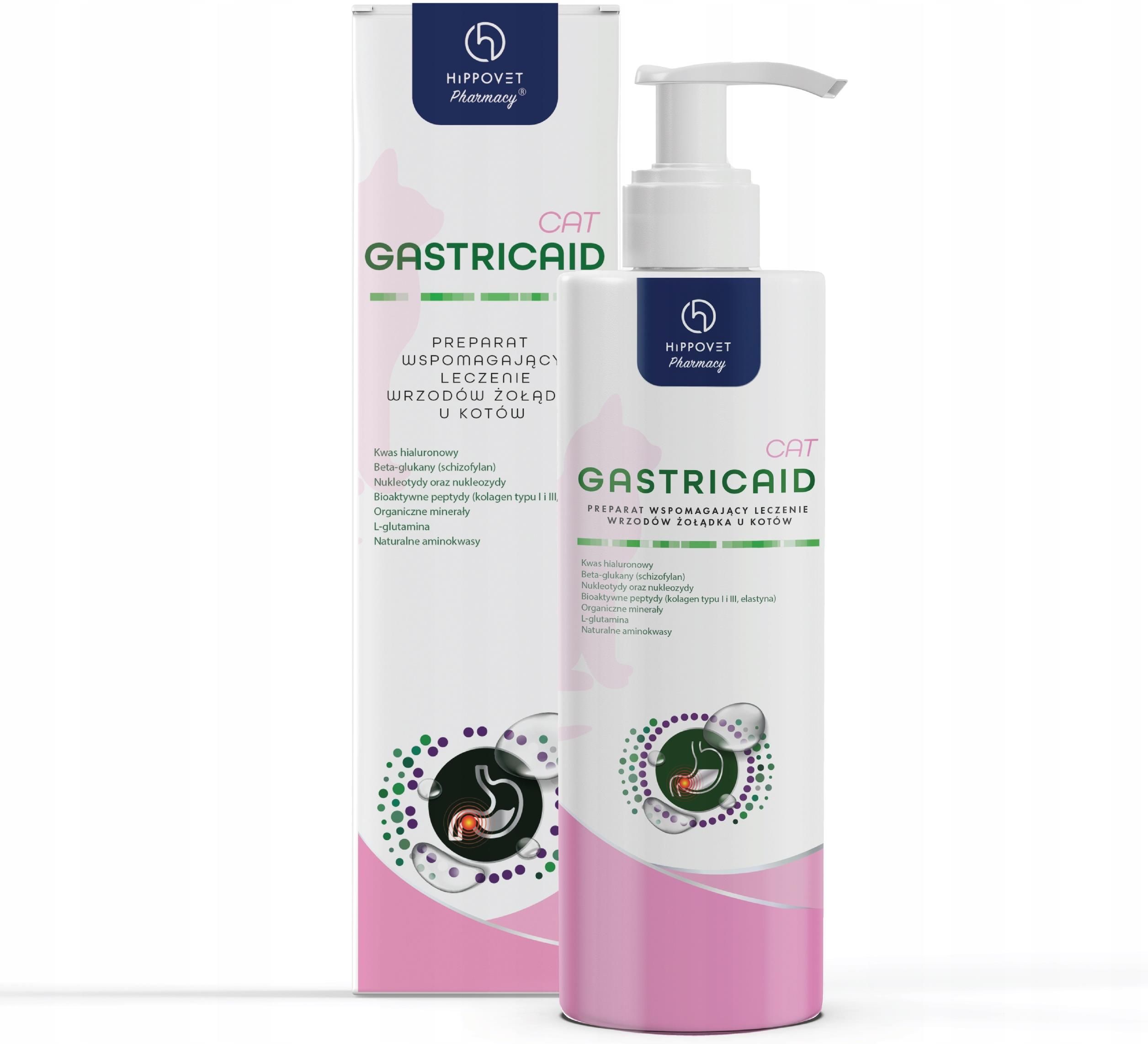 Hippovet Pharmacy GastricAid Cat 250ml GASTRICAID CAT to starannie opracowane połączenie wielkocząsteczkowego kwas hialuronowego, beta-glukanów i nukleotydów, które tworzą warstwę ochronną, powlekającą błonę śluzową żołądka. Dodatek organicznych minerałów (cynku, miedzi i selenu) …