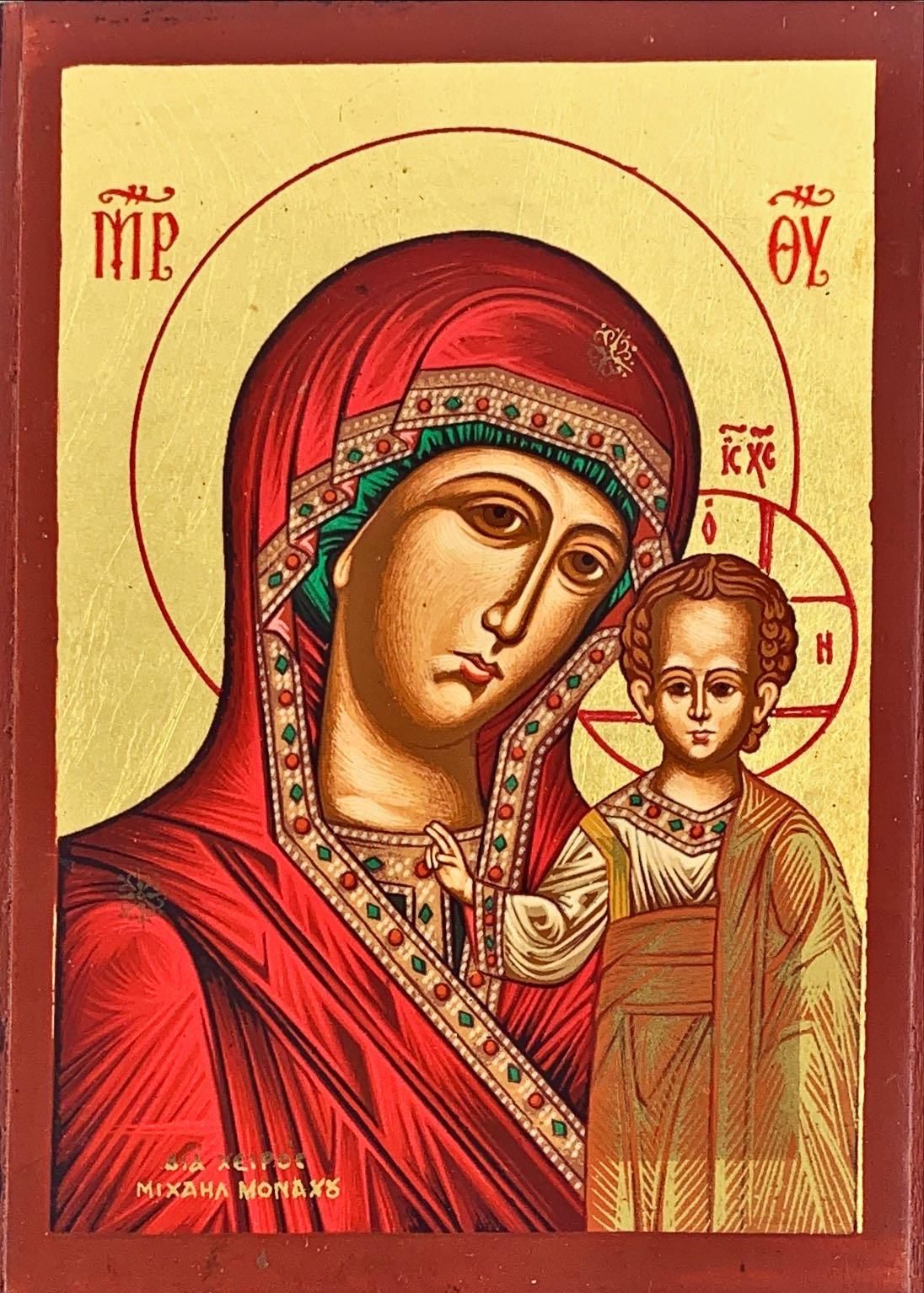 Ikona z wizerunkiem Matki Bożej z Jezusem, wykonana na desce. Do zawieszenia na ścianie. Ikona posiada stosowny certyfikat. Wysokość: 12,5 cm Szerokość: 9 cm Grubość deski: 1,5 cm