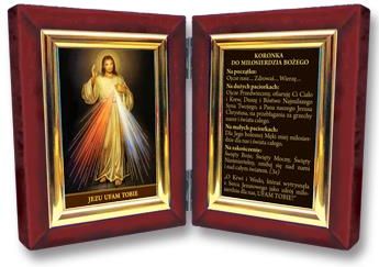 Drewniany dyptyk w aksamitnej bordowej oprawie, z wizerunkiem Jezusa Miłosiernego i Koronką do Miłosierdzia Bożego. Do postawienia w wybranym miejscu.