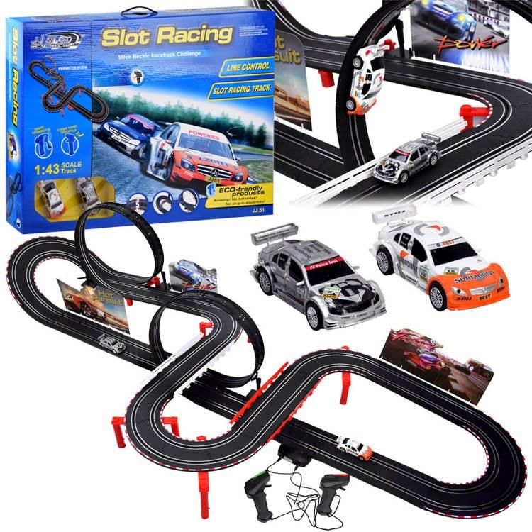 Extra długi wyścigowy tor samochodowy to marzenie każdego małego fana rajdów i wyścigów samochodowych. Tor o długości 912 cm z dwoma autkami, ekstremalnymi pętlami, zakrętami zapewni mnóstwo emocji podczas zabawy. Tor został wykonany w skali 1:43 z dbałością o szczegóły, co sprawia, że wygląda bardzo efektownie. Dwa superszybkie autka świetnie trzymają się drogi. Sterowanie pojazdami odbywa się za pomocą dwóch pilotów, które zostały wyposażone w opcję dodawania gazu. Zabawka nie wymaga użycia baterii, pojazdy zasilane są za pomocą zasilacza. Zestaw zawiera: - 2 sportowe auta - 2 joystiki przewodowe - elementy trasy (proste, zakręty, pętle) - pozostałe elementy toru (bandy, mosty, oznakowania toru) - zasilacz Specyfikacja: - długość trasy: 912 cm - powierzchnia toru po rozłożeniu: 214 x 85 x 39 cm - szerokość toru: 11,5cm - rozstaw szyny: 1,5cm - sterowanie pilotem z funkcją dodawania gazu Wymiary autka: - długość ok: 10 cm - wysokość ok: 3,5 cm - szerokość ok: 4,5 cm To wyścigowy zapewni wiele godzin niezapomnianej zabawy każdemu fanowi wyścigów samochodowych. Zestaw zapakowany w bardzo ładne kolorowe opakowanie, idealnie sprawdzi się jako prezent dla fana wyścigów. Sklep Dinusie oferuje szeroki wybór zabawek dla małych kierowców.