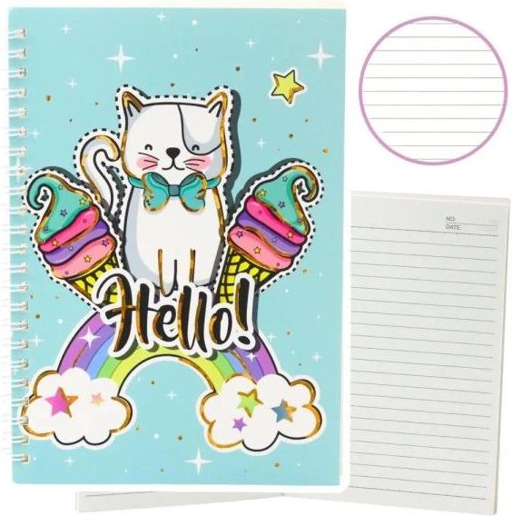 NOTATNIK / ZESZYT W LINIE KOT JEDNOROŻEC Z LODAMI I TĘCZĄ TURKUSOWY 60 KARTEK A5 Kolorowy i radosny notatnik z motywem bajkowego kota jednorożca to idealny wybór dla dzieci, które uwielbiają fantazyjne grafiki i pastelowe kolory.