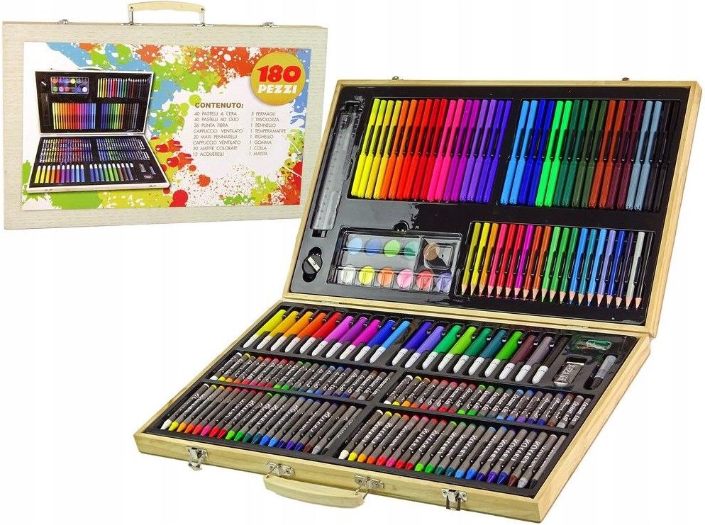 Artistic Painting Set Wooden Suitcase 180 Pieces Stimulate your child's imagination and creative abilities with an art set. The magic suitcase contains everything you need to play: crayons, markers, pastels, paints and other useful items for artistic creation: ruler, eraser, brush, etc. The …