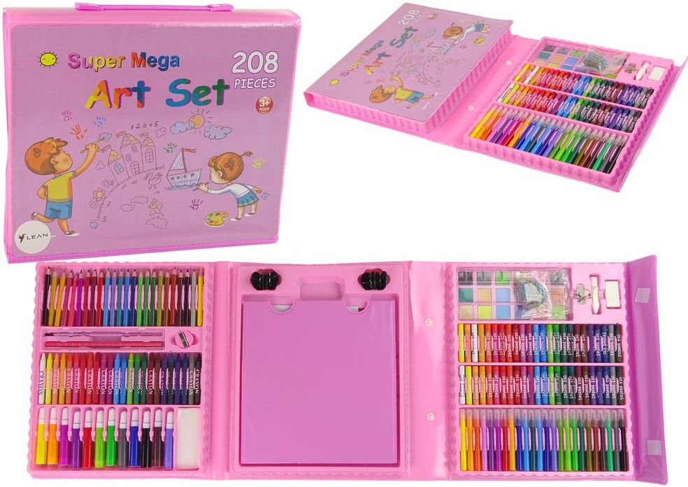 ZESTAW DO MALOWANIA XXL W WALIZCE 208 ELEMENTÓW Przy pomocy ogromnego wyboru kredek, pisaków, pasteli olejnych, pasteli świecowych, farb akwarelowych, temperówki, kleju, korektora, gumki do mazania, kartek a4 z łatwością stworzymy najbardziej wymyślne, kreatywne i oryginalne prace. Całość …