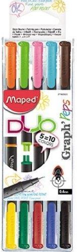 Cienkopis Graph Peps Duo Dwustronny 5szt 10 Kolorów Etui Maped 749250 Dwustronne cienkopisy Graph'Peps DUO - w o połowę mniejszym rozmiarze zostały skompresowane wszystkie liczne zalety standardowych cienkopisów Graph'Peps czyli końcówka oprawiona w metal o grubości 0,4mm, bezpieczna, wentylowana …