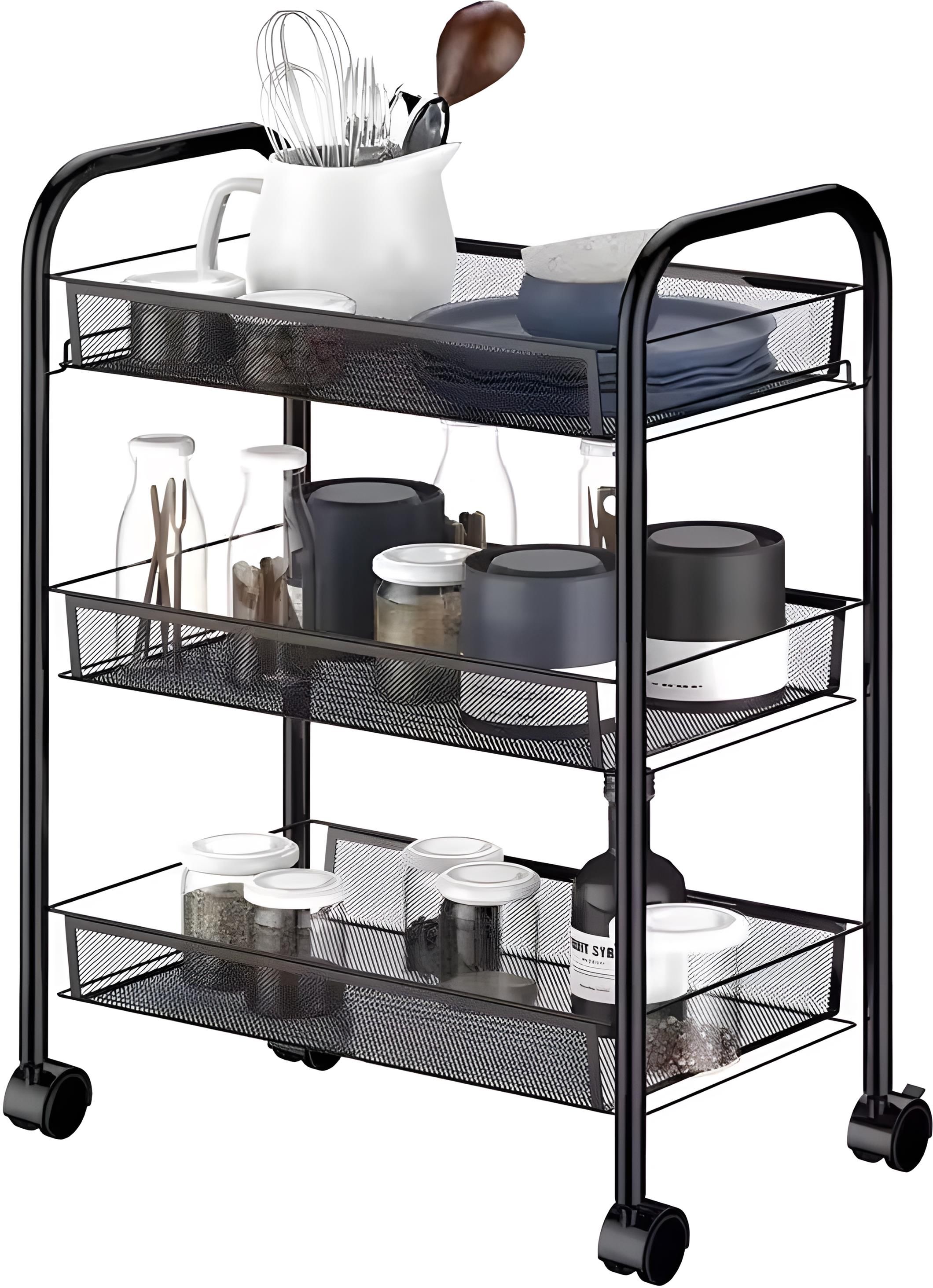 PRAKTYCZNY MOBILNY REGAŁ ORGANIZER Idealnie sprawdzi się w każdym pomieszczeniu domu 3 półki w formie koszyków Wyposażony w 4 kółka, w tym 2 z blokadą Stabilna i trwała, metalowa konstrukcja 4 haczyki, które można zamocować na półkach Produkt do samodzielnego montażu Produkt marki ModernHome …