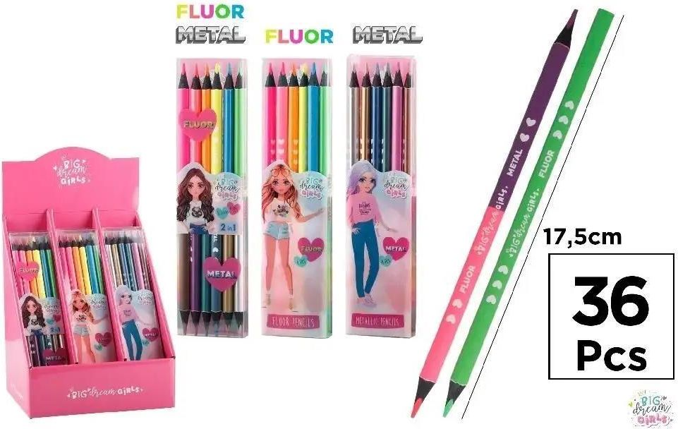 Dwukolorowe Kredki dla Kreatywnych Te dwukolorowe kredki ołówkowe posiadają drewniany korpus pokryty lakierem w kolorze grafitu. Dzięki trójkątnemu kształtowi są niezwykle wygodne w użyciu i łatwo leżą w dłoni. Kredki cechują się dużą odpornością na wstrząsy i dobrze się ostrzą, co czyni je idealnym narzędziem do kreatywnych dekoracji i rysunków. Każda kredka ma podwójną końcówkę: z jednej strony metaliczną, a z drugiej fluorescencyjną. W zestawie znajduje się 6 kredek, co daje łącznie 12 różnych kolorów: 6 metalicznych i 6 fluorescencyjnych. MIX wzorów - wysyłka losowa. Cena za sztukę. EAN: 8435250902606