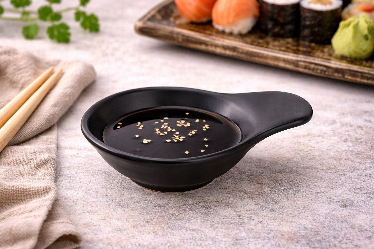 Porcelanowa dipówka do serwowania z rączką czarna 50 ml Stylowa i praktyczna dipówka porcelanowa w czarnym kolorze to doskonały wybór do eleganckiego serwowania sosów, dipów oraz niewielkich dodatków do dań. Minimalistyczna forma połączona z wygodną rączką sprawia, że naczynie prezentuje się nowocześnie i jednocześnie jest bardzo wygodne w codziennym użytkowaniu. Czarna porcelana pięknie podkreśla kolor serwowanych dodatków, dzięki czemu dipówka doskonale sprawdzi się zarówno na domowym stole, jak i w gastronomii. To świetne naczynie do podawania sosu sojowego, dressingów, oliwy, past, dipów, marynat, oliwek czy drobnych przekąsek. Poręczna rączka ułatwia chwytanie i przenoszenie, a kompaktowy rozmiar sprawia, że dipówka nie zajmuje wiele miejsca na stole. Gładka powierzchnia i ponadczasowy design sprawiają, że naczynie łatwo dopasować do różnych stylów zastawy, od nowoczesnej po klasyczną. To niewielki, ale bardzo efektowny element wyposażenia kuchni i jadalni. Najważniejsze cechy produktu materiał: porcelana ● kolor: czarny ● długość z rączką: 11 cm ● średnica: 8 cm ● wysokość: 2,5 cm ● pojemność: 50 ml ● gładka powierzchnia ● wygodna rączka ułatwiająca serwowanie ● możliwość mycia w zmywarce Zastosowanie Dipówka idealnie nadaje się do serwowania: ● sosów i dipów ● dressingu i oliwy ● wasabi, sosu sojowego i dodatków do sushi ● niewielkich przekąsek i dodatków do dań Pielęgnacja Produkt można myć w zmywarce. Należy unikać gwałtownych zmian temperatury, uderzeń oraz upadków. Ze względu na charakter materiału i proces produkcji mogą wystąpić drobne skazy, wgłębienia, delikatne rysy lub kropeczki, które nie wpływają na funkcjonalność produktu i nie stanowią podstawy do reklamacji. Zdjęcie aranżacyjne ma charakter poglądowy. Prezentowana aranżacja może zawierać elementy dekoracyjne niewchodzące w skład zestawu. Szczegóły dotyczące zawartości znajdują się w opisie produktu.