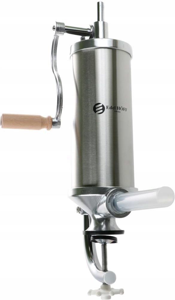 Nadziewarka do kiełbasy z wsadem 2 kg Idealna dla amatorów masarnictwa oraz dla małych masarni. Nadziewarka umożliwia produkcję szerokiego asortymentu kiełbas - od kabanosów i parówek do klasycznych kiełbas. Nadziewarka do mięsa to niezawodne urządzenie, z którym z łatwością przyrządzimy domowe kiełbasy, kaszanki i pasztety. Służy do napełniania jelit dowolnym farszem, zazwyczaj mieszaniną mięsa, tłuszczu, wody oraz przypraw. Zapewnia bezpieczne i komfortowe nadziewanie, a także jest prosta w utrzymaniu czystości. Wykonany jest z wysokiej jakości stopu stali nierdzewnej, korba z wytrzymałego żeliwa, zaś lejki z tworzywa sztucznego. Solidna i szczelna konstrukcja pozwala w szybki i wygodny sposób przygotować domowe wyroby mięsne, a także odznacza się nowoczesnym designem (dokładnie wypolerowana stal, srebrny kolor i wyjątkowo poręczny uchwyt). Wykazuje właściwości antybakteryjne, dzięki temu podczas pracy nie wchodzi w reakcję z żywnością. Lekkość i łatwa obsługa gwarantuje sprawne oraz bezpieczne nadziewanie. Dodatkowo praktyczność nadziewarki zwiększa silikonowy uszczelniacz tarczy docisku. Cechy produktu Wykonana wysokiej jakości stali nierdzewnej Bardzo prosta konstrukcja sprawia, że nadziewarka jest prosta w czyszczeniu i użyciu Nadziewarka wyposażona jest w silikonowy tłok, który jest zdecydowanie bardziej efektywny niż metalowe Dodatkowo w zestawie 4 lejków o różnych średnicach: 15/19/22/25 mm W zestawie również uchwyt do mocowania do blatu o maksymalnej grubości do 4 cm Średnica tuby: 11 cm Pojemność: 2 kg Wysokość tuby: 23,5 cm Wysokość całkowita: 50 cm