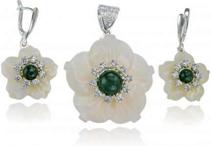 NORBISREBRO SREBRNY KOMPLET KWIATKI Z MASY PERŁOWEJ MALACHIT I CYRKONIE Nowe Brzesko