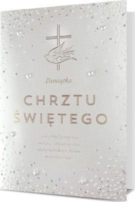 Karnet Pamiątka Chrztu Świętego B6 z kopertą, złotym nadrukiem, zdobiony błyszczącymi elementami dekoracyjnymi. Z życzeniami w środku. Treść życzeń: Z okazji przyjęcia Sakramentu Chrztu Świętego serdeczne życzenia trwania w opiece Bożej Miłości. Niech ona Cię prowadzi po właściwych ścieżkach ku …
