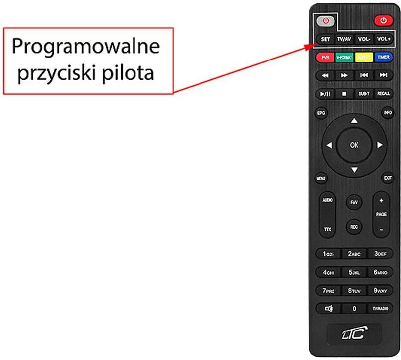 PILOT IDEALNIE PASUJE DO DEKODERÓW LTC: DVB1 DVB2 DVB3 DVB4 DVB202 DVB302 DVB205M STICK Pilot został wyposażony w 4 programowalne przyciski. Dzięki temu użytkownik ma możliwość zaprogramowania jednego pilota do obsługi zarówno dekodera jak i np. telewizora co znacznie ułatwia korzystanie z urządzeń. Pilot posiada możliwość zaprogramowania 4 przycisków: TV/AV, VOL-, VOL+, POWER. W celu zaprogramowania przycisków należy: 1. Przytrzymać przycisk „SET” przez 3 sekundy, aż czerwona lampka znajdująca się w przycisku power, zaświeci się światłem ciągłym. 2. Krótko nacisnąć przycisk, który ma być programowany, czerwona lampka zacznie migać. Nakierować piloty na na siebie i wcisnąć przycisk którego funkcja ma być skopiowana do pilota LXHDT202. 3. Lampka na pilocie LXHDT202 zamiga, następnie zaświeci się światłem ciągłym. Znaczy to, że pilot przyjął funkcję i jest gotowy do programowania następnych przycisków. 4. W celu zaprogramowania następnego przycisku, należy powtórzyć operację od punktu numer 2. 5. W celu zakończenia programowania przycisków pilota należy nacisnąć przycisk „SET”, lampka zgaśnie a pilot przełączy się z trybu nauki do trybu pracy normalnej.