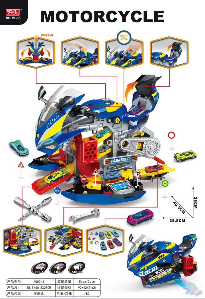 Opis MEGA Parking z Funkcją Dymu Motocykl Zabawka 2w1, duży motocykl i parking dla dzieci od trzeciego roku życia. Motocykl posiada świecące przednie reflektory oraz tylne światła. Wydaje odgłosy startu, jazdy, przyspieszania, a z jego rury wydechowej wydobywa się dym (po uzupełnieniu zbiorniczka wodą). Boki motorka możemy otworzyć i wówczas powstaje parking ze zjeżdżalniami, drogami i stacją benzynową . W zestawie znajdują się klucze do rozkręcania, 6 autek typu resoraki, znaki drogowe i pipetka na wodę. Motorek posiada wygodną rączkę do przenoszenia, został wykonany z najlepszej jakości tworzywa sztucznego, pięknie się prezentuje. Zabawka zasilana jest bateriami typu 3 x AAA 1,5 V (baterii brak w zestawie). Funkcje: dla dzieci od trzeciego roku życia, wykonany z najlepszej jakości materiałów, wygodna rączka do przenoszenia, otwierane boki motorka, a w środku parking dla pojazdów, efekty światła: reflektory, tylne światełka przy wylocie dymu, efekty dźwięku: odgłosy startu, jazdy, przyspieszania, dym wydobywający się z rury wydechowej, idealny zestaw prezentowy dla dzieci ciekawych świata. Wymiary motor ok. 38,5 cm x 22 cm x 27 cm, motor po rozłożeniu (funkcja parking) ok. 40 cm x 40 cm x 27 cm , klucze ok. 12,5 cm długości, resoraki ok. 7 cm x 3 cm x 2,5 cm, znaki ok. 5 cm długości, opakowanie ok. 39 cm x 28 cm x 16 cm. Zawartość zestawu motor, 3 x klucz, 6 x autko, naklejki dekoracyjne, śrubki, znaki drogowe, instrukcja.