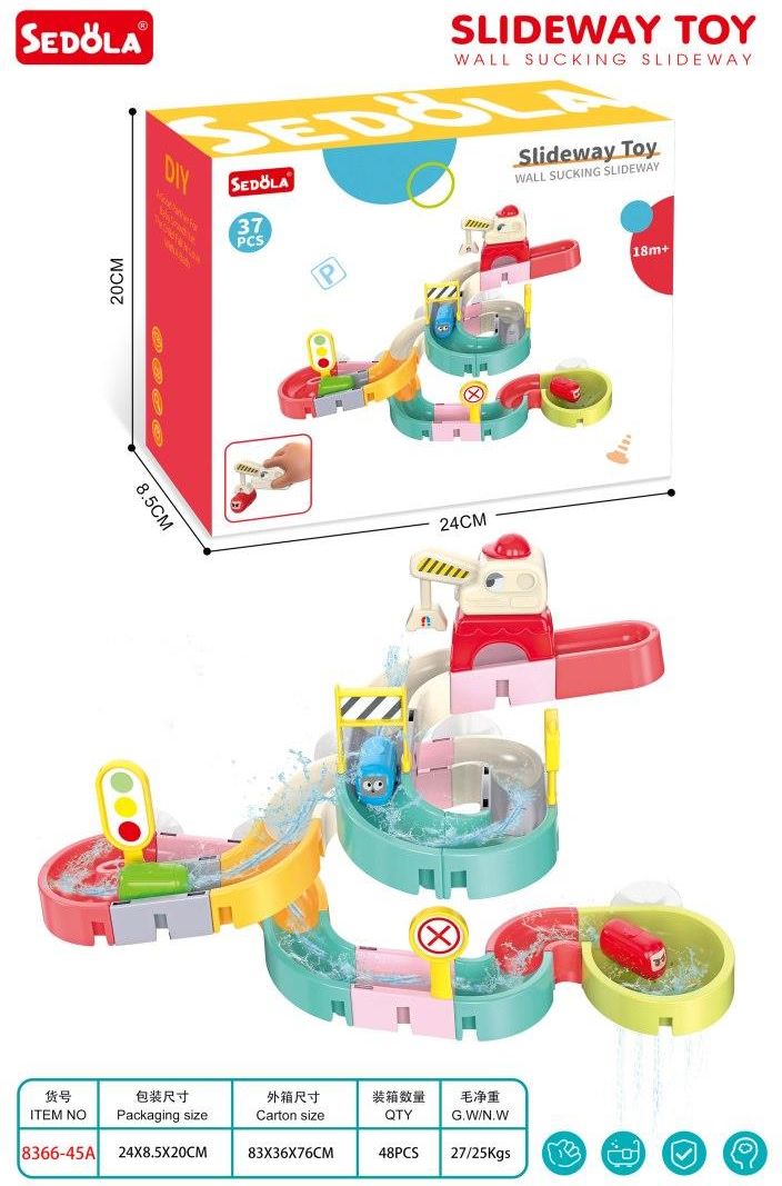 Opis Tor Przyczepiany do Kąpieli 37el. Tor, zjeżdżalnia dla autobusów, do kąpieli dla dzieci od osiemnastego miesiąca życia. Kolorowy tor umili niejedną kąpiel. Wykonany został z najlepszej jakości materiałów, bezpiecznych dla dziecka w żywych kolorach. Zestaw posiada przyssawki, dzięki którym można go przymocować do wanny czy innej płaskiej powierzchni. Po ustawieniu autobusów na starcie toru wystarczy polać je prysznicem, a popędzą torem prosto do wody. Funkcje: zestaw odpowiedni dla dzieci od osiemnastego miesiąca życia, wykonany z bezpiecznych dla dziecka materiałów, żywe kolory zachęcają do zabawy, mocne przyssawki, napędzany wodą, niezastąpiona zabawka do wody. Wymiary tor ok. 34 cm x 34 cm x 20 cm, autobus ok. 4,5 cm x 3 cm x 2 cm, opakowanie ok. 24,5 cm x 20 cm x 8,5 cm. Zawartość zestawu elementy konstrukcyjne toru, sześć przyssawek, 3 autobusy, znaki drogowe, szlabany, instrukcja, naklejki dekoracyjne.
