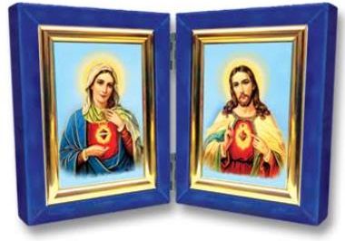 Drewniany dyptyk w aksamitnej granatowej oprawie, z wizerunkiem Serca Jezusa i Serca Maryi. Do postawienia w wybranym miejscu.