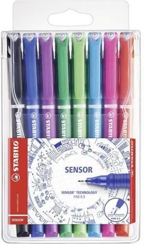 CIENKOPIS STABILO SENSOR. Cienkopis z amortyzowaną końcówką. Idealny cienkopis dla wymagających twórców i kreatywnych umysłów. Nowoczesny design w 8 intensywnych kolorach. Mocna amortyzowana końcówka oprawiona w metal uniemożliwia wygięcie lub złamanie i daje komfort podczas pisania. Doskonale sprawdza się przy pracy z linijką lub szablonem. Wentylowana skuwka. Szerokość linii 0,3 mm. Plastikowe etui z zawieszką zawiera 8 szt cienkopisów we wszystkich kolorach.