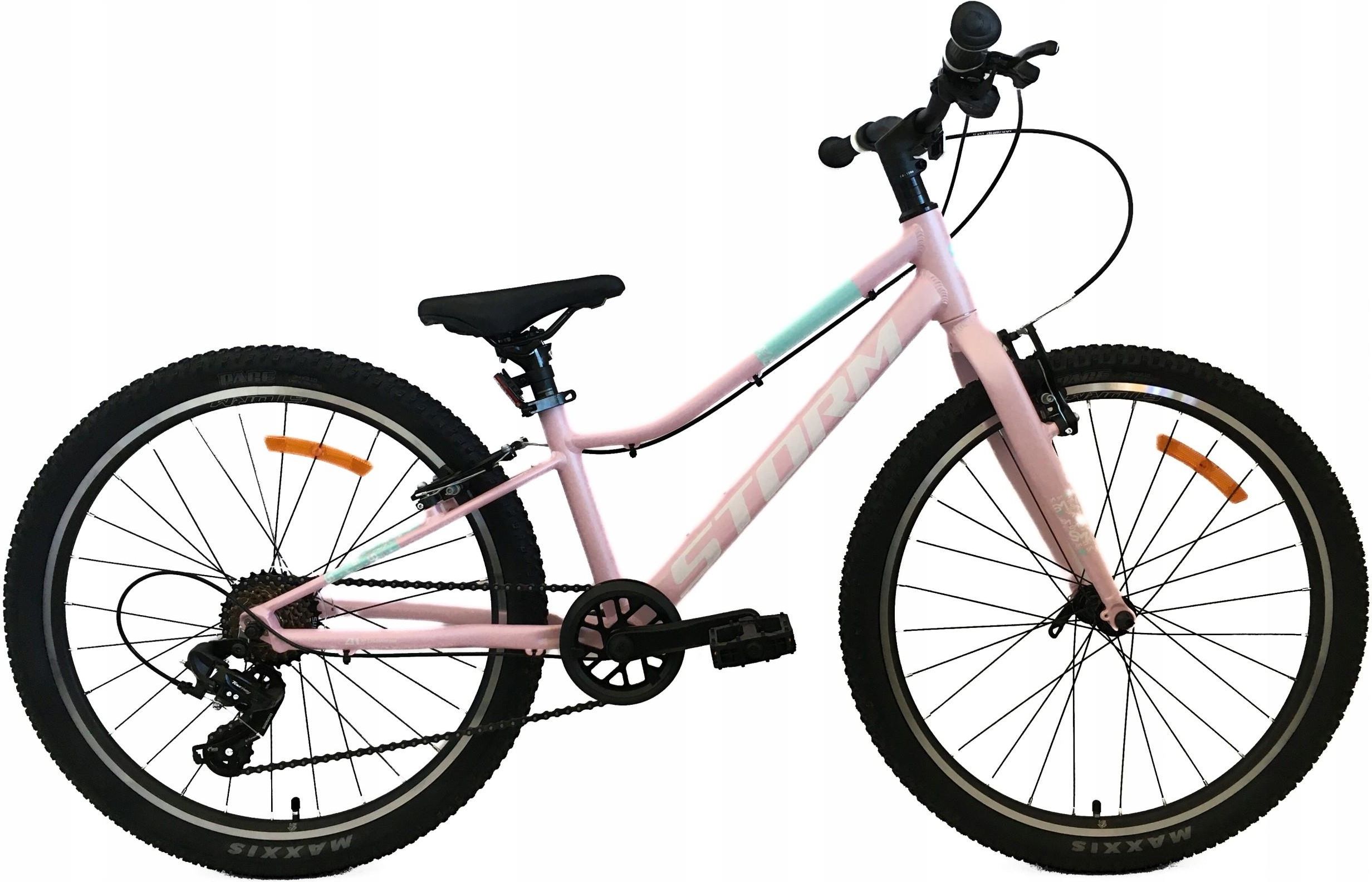 STORM BELLA 24 2VBR Rozmiar ramy: 11" BIEGI: 7 SPECYFIKACJA WIDELEC SZTYWNY ALUMINIOWY KASETA WOLNOBIEG SHIMANO 7 SPEED KIEROWNICA UNO - 560 MM KORBA ALUMINIOWA 30T - 140 MM ŁANCUCH YBN OBRĘCZ STORM ALUMINIOWA OPONA 24 x 2.10 MAXXIS PEDAŁY FP-629 BLACK PIASTA PRZÓD ALUMINIOWA PIASTA TYŁ ALUMINIOWA SIODŁO STORM SUPORT CARTRIDGE / ŁOŻYSKA MASZYNOWE WSPORNIK SIODŁA ALUMINIOWY 27,2 MM WSPORNIK KIEROWNICY ALUMINIOWY AHEAD CHWYTY HERRMANS