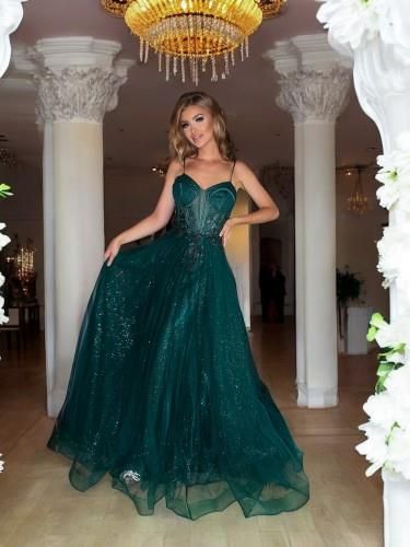Zjawiskowa długa sukienka tiulowa. Góra sukienki dobrze dopasowana gorsetowa, ozdobiona mieniącymi się kamieniami. Wszyte miseczki pozwalają na nie zakładanie biustonosza. Cienkie ramiączka, tył lekko odkryty sznurowany i zapinany na zamek. Dół sukienki uszyty z dwóch warstw tiulu i mieniącej się …