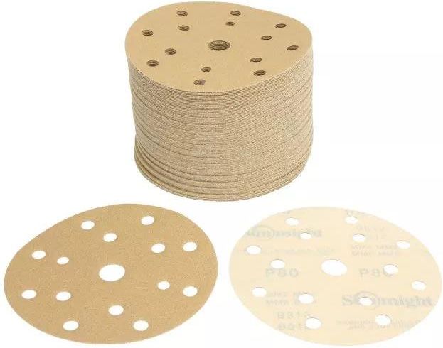 Papier ścierny, gold, krążek 150mm, gradacja p80, liczba otworów: 15, mocowanie: rzep, opakowanie 100szt., wodoodporność: nie, kolor beżowy.