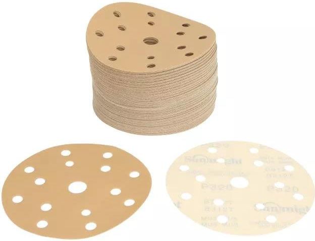 Papier ścierny, gold, krążek 150mm, gradacja p320, liczba otworów: 15, mocowanie: rzep, opakowanie 100szt., wodoodporność: nie, kolor beżowy.