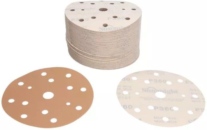 Papier ścierny, gold, krążek 150mm, gradacja p360, liczba otworów: 15, mocowanie: rzep, opakowanie 100szt., wodoodporność: nie, kolor beżowy.