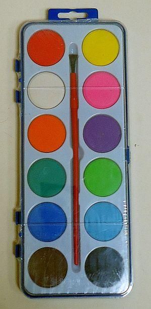• zestaw farb akwarelowych • farby mają postać suchych guziczków o średnicy 28 mm umieszczonych w plastikowym opakowaniu, wieko opakowania może stanowić paletę do mieszania farb • po zwilżeniu wodą niemal natychmiast uzyskuje się gotowe do użycia farby, a w zależności od sposobu użytkowania (np. ilości dodanej wody) można otrzymać różne efekty • w komplecie pędzelek • farby akwarelowe to farby wodne służące do malowania na papierze, których cechą charakterystyczną jest czystość i transparentność plam barwnych • szybko schną, idealne dla hobbystów oraz dzieci