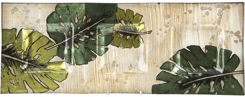 Ręcznie malowana, szklana podstawka ozdobna. Stanowi bardzo praktyczny element dekoracji domu. Doskonały dodatek zarówno do wnętrz klasycznych jak i nowoczesnych. Udekorujesz nią stół, ławę, komodę czy parapet. Generalnie będzie wyglądać świetnie na każdej płaskiej powierzchni. Podstawkę można skompletować z innymi produktami kolekcji o tym samym wzorze. Podszkliwny dekor w postaci listków rozweseli wnętrze i nada mu oryginalności.Na spodzie podstawki umieszczone są miękkie, antypoślizgowe stopki, dzięki którym mamy pewność, że produkt nie zarysuje żadnej powierzchni. Podstawka od spodu jest w kolorze czarnym. Szklane ozdoby od wieków goszczą w każdym domu. Nie może zabraknąć także tego elementu dekoracji. Podstawka śmiało posłuży jako świecznik na świece typu t-light lub czworokątne, klubowe. Zapachowe świeczki będą strzałem w dziesiątkę. Pomieszczenie nie tylko nabierze przyjemnej woni, ale także niezwykle interesującej atmosfery. Podstawka/świecznik pomieści 3 świece.