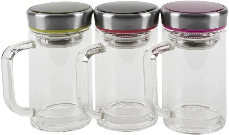 Zakręcany szklany kubek z rączką. Posiada podwójne ścianki. Wypełniony napojem ciekawie się prezentuje. Kubek wyposażony jest dodatkowo w sitko. Dostępne są trzy warianty kolorystyczne nakrętek: czarna, zielona i różowa. W razie niepodania koloru w komentarzu towar jest wysyłany losowo. Cena dotyczy 1 sztuki.