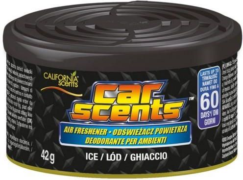 Zapach California Car Scents Ice 42g Produkty California Scents są znane i cenione na całym świecie, to co cechuje markę to najwyższa jakość produktów. Zapachy te produkowane są w słonecznej Kalifornii w USA, z wykorzystaniem naturalnych składników. W środku puszki znajdują się 3 bloczki wytworzone z drzewa cedrowego, które nasączone są po brzegi wyjątkowymi olejkami zapachowymi które w znakomity sposób wypełnia Twój samochód ulubionym zapachem. Bardzo estetyczny i designerski wygląd zapachu w postaci metalowej puszki z ładną etykietą perfekcyjnie wkomponuje się w każde miejsce Twojego samochodu np. pod fotel, do schowka lub miejsce na kubek. Producent zadbał jednak nie tylko o estetykę samego opakowania, ale również o możliwość regulacji intensywności zapachu. Dzięki plastikowemu otwarciu tzw. "wiatrakowy" możemy w płynny sposób dozować dawkę zapachu. Stosując zapach w temperaturze powyżej 8 stopni Celsjusza będziemy mogli cieszyć się jego największą intensywnością nawet do 60 dni. Po tym czasie należy obrócić wkład w pojemniku i umieścić go np. w szafie lub szufladzie. Dzięki temu zapach utrzyma się jeszcze przez kilka tygodni.
