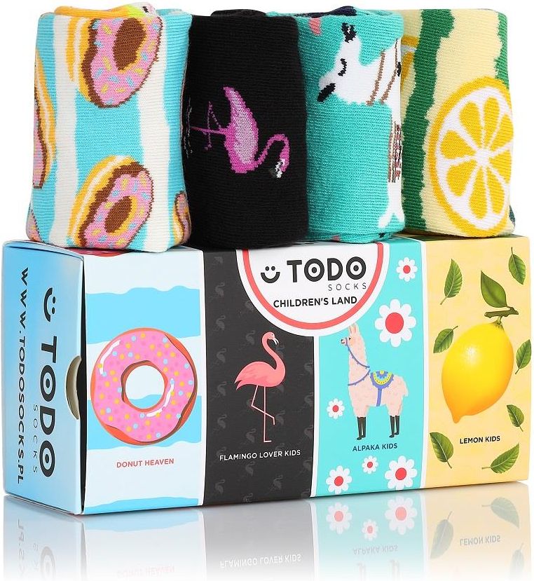 Opis produktu Kolorowy zestaw skarpetek dziecięcych Todo Socks, model: CHILDREN'S LAND. W środku pudełka czeka na Ciebie losowa gra planszowa wraz z akcesoriami. Nie wyrzucaj pudełka, wykorzystaj je do zabawy!:) Aktualnie dostępne gry dodawane do zestawów: Gra Kitchen Boss Todo SOCKS, to polska marka produkująca kolorowe skarpety nie do pary. Nasze modele charakteryzuje najwyższa jakość oraz niebanalne wzornictwo. Zestaw zabawnych skarpetek, to idealny pomysł na prezent. Długie skarpety TODO zostały zaprojektowane i wykonane w Polsce z najwyższej jakości bawełny. Dobieraj skarpety do nastroju, zainteresowań, pory roku. Bojkotuj szarą rzeczywistość przemierzając świat w kolorowych skarpetkach nie do pary. Nie bój się odmienności, to ona jest twórcą najlepszych pomysłów. TODO SOCKS to rewolucyjna marka, która łączy niepoprawnych optymistów. Zestaw zawiera 4 pary skarpetek dziecięcych: Skład wesołych skarpet TODO SOCKS: 80 % bawełna 17 % Poliamid 3 % Elastan Lewa i prawa skarpetka jest inna, tak jak na zdjęciu. Jak dbać o kolorowe skarpety, aby zachowały idealny kolor i trwałość? Pierz skarpety maksymalnie w 30 stopniach, Susz wesołe nie do pary w pozycji pionowej, Nie susz skarpet TODO SOCKS bębnowo Poświęć czas na relaks, nie prasuj kolorowych skarpet :) TODO SOCKS nie lubią wybielania
