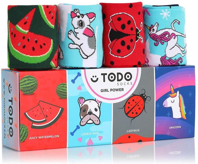 Opis produktu Kolorowy zestaw skarpetek Todo Socks, model: GIRL POWER. W środku pudełka czeka na Ciebie losowa gra planszowa wraz z akcesoriami. Nie wyrzucaj pudełka, wykorzystaj je do zabawy!:) Aktualnie dostępne gry dodawane do zestawów: Gra Kitchen Boss Gra Drunken Sailor Todo SOCKS, to polska marka produkująca kolorowe skarpety nie do pary. Nasze modele charakteryzuje najwyższa jakość oraz niebanalne wzornictwo. Zestaw zabawnych skarpetek, to idealny pomysł na prezent. Długie skarpety TODO zostały zaprojektowane i wykonane w Polsce z najwyższej jakości bawełny. Dobieraj skarpety do nastroju, zainteresowań, pory roku. Bojkotuj szarą rzeczywistość przemierzając świat w kolorowych skarpetkach nie do pary. Nie bój się odmienności, to ona jest twórcą najlepszych pomysłów. TODO SOCKS to rewolucyjna marka, która łączy niepoprawnych optymistów. Zestaw zawiera 4 pary skarpetek: Skład wesołych skarpet TODO SOCKS: 80 % bawełna 17 % Poliamid 3 % Elastan Lewa i prawa skarpetka jest inna, tak jak na zdjęciu. Jak dbać o kolorowe skarpety, aby zachowały idealny kolor i trwałość? Pierz skarpety maksymalnie w 30 stopniach, Susz wesołe nie do pary w pozycji pionowej, Nie susz skarpet TODO SOCKS bębnowo Poświęć czas na relaks, nie prasuj kolorowych skarpet :) TODO SOCKS nie lubią wybielania