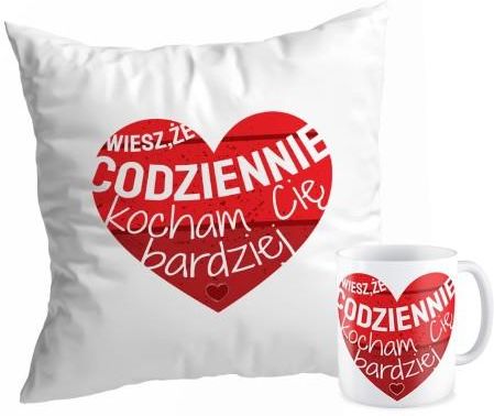 Miłość czuć w powietrzu... wiadomo. Poduszka świetnie sprawdzi się na wspólne, romantyczne wieczory. Z pewnością dla Niej i dla Niego będzie świetnym pomysłem na prezent z okazji dnia Walentego, a także bez okazji. Kawka lub herbata w takim kubku umili poranki i nie tylko. Idealny zestaw dla zakochanych cały rok ;) PODUSZKA Tylko u nas w tak atrakcyjnej cenie otrzymujesz poduszkę ze zdejmowaną poszewką. Dzięki takiemu rozwiązaniu poszewkę możesz w każdej chwili wyprać, nie narażając wkładu na utratę swych właściwości elastycznych. Każda poduszka pakowana w woreczek foliowy. Opis produktu: ROZMIAR: 40cm x 40cm (+/- 2cm) POSZEWKA: materiał: mikrofibra gramatura: 90 wyposażona w zamek błyskawiczny WKŁAD: 100% włókno silikonowe 1 gatunek antyalergiczny NADRUK: pełnokolorowy, niewyczuwalny w dotyku, żywe kolory KUBEK Opis produktu: Powłoka: wielowarstwowa utwardzana De Lux Pojemność: 330ml Wysokość: 93mm Nadruk: pełnokolorowy, niewyczuwalny w dotyku Rozmiar nadruku: max. 190mm - 93mm Nadruk odporny na mycie w zmywarce