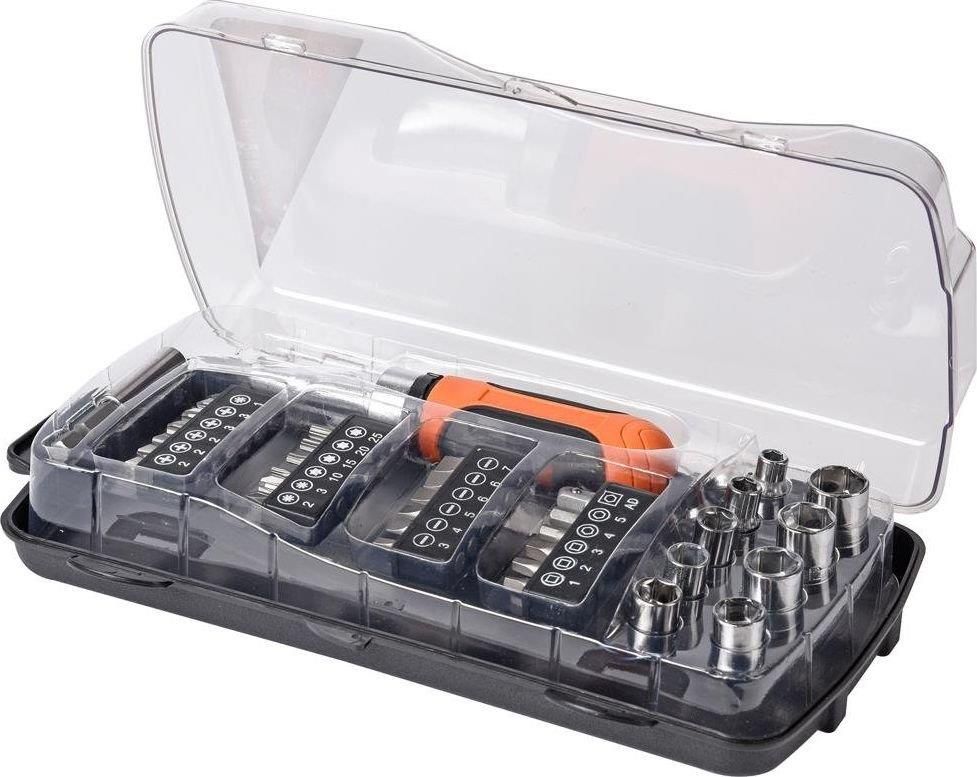 Zestaw kluczy z grzechotką 36 elementowy Zestaw wkrętaków śrubokręt, klucz z grzechotką 36 elementowy 36-częściowy zestaw wkrętaków z grzechotką. Zestaw składa się z różnych końcówek i nasadek, dzięki którym z łatwością wykonasz każdą pracę. Specyfikacja techniczna: 1x) Śrubokręt ściągaczki 2x) przedłużenie 1x) Śrubokręt ściągaczki2x) przedłużenie bity: 1x) SL3MM bit,1x) SL4MM bit,1x) SL5MM bit,2x) SL6MM bit, 1x) SL7MM bit, 3x) bity PH2, 2x) bity PH3,1x) Bit H4,1x) Bit H5 1x) bit PZ1, 1x) bit PZ2, 1x) bit PZ3, 1x) bit S1, 1x) bit S2, 1x bit S3 1x) Bit T10, 1x) Bit T15, 1x) Bit T20, 1x) Bit T25 1x) nasadka 5MM, 1x) nasadka 6MM, 1x) nasadka 7MM, 1x) nasadka 8MM, 1x) nasadka 9MM, 1x) nasadka 10MM, 1x) nasadka 11MM, 1x) nasadka 12MM, 1x) nasadka 13MM Zestaw wkrętaków śrubokręt klucz z grzechotką 36 elementowy