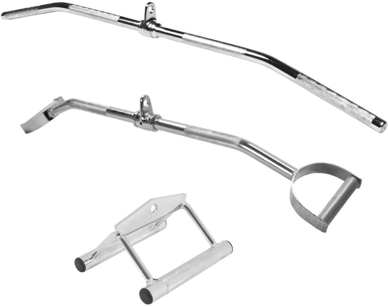 W skład zestawu wchodzą 1 x drążek szeroki długość: 118 cm waga: 5 kg średnica uchwytu: 2,5 cm maksymalne obciążenie: 200 kg 1 x drążek lekko zakrzywiony strzemię równoległe długość: 93 cm waga: 6,5 kg średnica uchwytu: 2,6 cm maksymalne obciążenie: 200 kg 1 x uchwyt równoległy krótki długość: 19 cm waga: 2 kg średnica uchwytu: 2,5 cm maksymalne obciążenie: 200 kg Zestaw uchwyty i drążki chromowane do wyciągu Różne warianty uchwytów oferują wiele nowych opcji ćwiczeń, dzięki którym trening będzie bardziej intensywny i ciekawy.