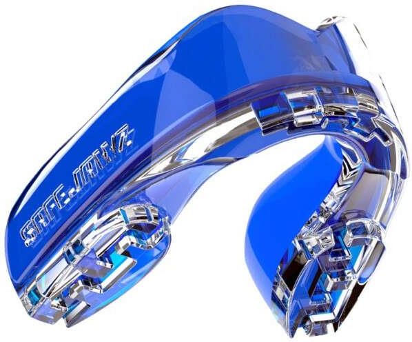 Ochraniacz szczęki marki Safe Jawz. Kolor: niebieski Materiał: silikon Przeznaczony dla osób do 11 roku życia. Konstrukcje ochraniaczy szczęk Safe Jawz i materiały z których są wykonane umożliwiają użytkownikowi bardzo dokładne dopasowanie ochraniaczy do uzębienia w czasie krótszym niż 10 minut, a także umożliwiają wielokrotną korektę dopasowania , nieporównywalną do zwykłych ochraniaczy szczęk ich ochronę a przy tym są bardzo efektowne wizualnie. Zawodnicy oraz fani lubią się wyróżniać i chętnie wybierają te szczęki do noszenia. Ochraniacze szczęk Safe Jawz składają się z podwójnych warstw ochronnych zespolonych ze sobą i doskonale pochłaniających energię uderzenia , posiadają 3 opatentowane systemy FluidFit , JawSecure i RemodelTech. Pierwszy system dzięki płynnemu składnikowi materiału służy bardzo dokładnemu uformowaniu się ochraniacza i dopasowaniu go do uzębienia, drugi zapewnia lepsze pochłonięcie energii poprzez specjalnie zaprojektowane zaciski między dwoma warstwami ochraniacza a trzeci umożliwia użytkownikowi ponowne umodelowanie ochraniacza jeśli przy jego formowaniu niedokładnie dokonał zgryzu i istnieje konieczność poprawienia modelingu ochraniacza. Ochraniacze Safe Jawz są zapakowane w indywidualne i estetyczne etui. OCHRANIACZ SZCZĘKI MARKI SAFE JAWZ Z ETYKIETĄ POTWIERDZAJĄCĄ 100% ORYGINALNOŚCI