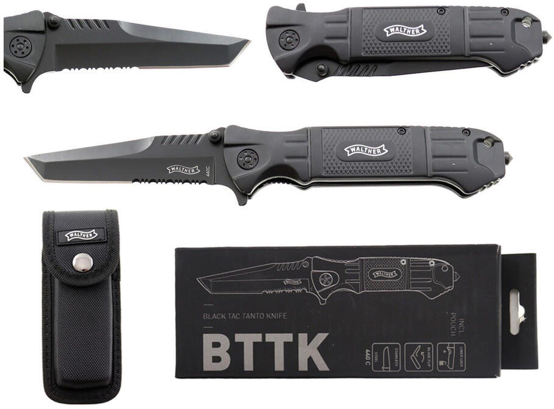 Walther Tanto niemieckiej firmy Umarex to nowoczesny taktyczny nóż składany, który idealnie nadaje się do codziennego noszenia. Ostrze o długości 98 mm i grubości 3,3 mm wykonane z wysokiej jakości stali nierdzewnej 440C z czarną powłoką ochronną ma kształt typowy dla japońskich noży tanto z połączeniem gładkiej i ząbkowanej krawędzi. Otwieranie jedną ręką ułatwia kołek umieszczony w górnej części ostrza. Można również użyć flippera na dolnej krawędzi ostrza, który w pozycji otwartej zabezpieczony jest blokadą typu linerlock. Rękojeść posiada aluminiowe wzmocnienia o charakterystycznej fakturze powierzchni, zapewniające pewniejszy, ale wygodny chwyt. Z tyłu rękojeści znajduje się końcówka do rozbijania szkła. Praktyczną cechą jest otwór na końcu rękojeści na linkę do zawieszenia noża. Walther Tanto ma klips do noszenia na pasku lub do zamocowania w kieszeni i jest dostarczany z nylonową pochwą. Parametry: Materiał ostrza: stal nierdzewna 440C Materiał rękojeści: aluminium